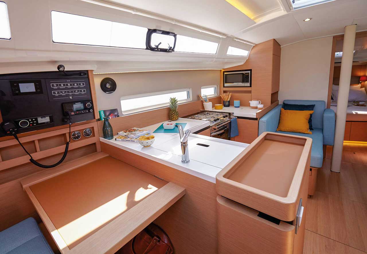 The interior is at once surprising and consistent with the Sun Odyssey line, where innovation serves to heighten the aesthetic and the level of comfort. Designed by Jean-Marc Piaton and his crew, the interior design reveals stunning potential for a sailboat of this size.